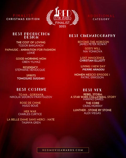 - 杉崎智介監督作品の映画『SPIRITS(精霊)』(海外版)が国際映画祭『Red Movie Awards 2025』にノミネートされ、BEST PRODUCTION DESIGN(最優秀美術賞)ファイナリストに選出されました。