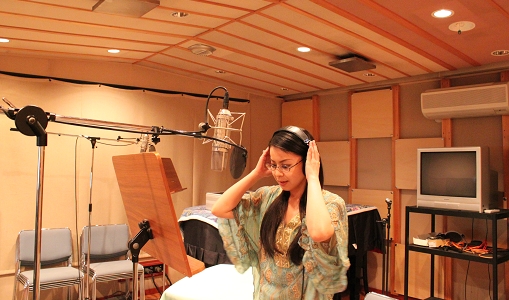 『今日は私の新曲「Love is...」についてお話しをしたいなと思いまして。先日、レコーディングを無事に終えまして、私も目一杯歌ってきました。今回歌わせていただいたのがサンスクリット語で、本当に初めてのチャレンジで、もう右も左も分からない言語でした。だけど、本当に監督に感謝しているんですけれど、レコーディングに入る前に、この歌詞の意味と世界をぽんと置いていかれる訳ですよ。こうやって歌うと良いよって。それで、「なるほど。あ~っ!」って。経験の浅い私が言うのもどうかと思うのですが、歌っていうのは技術だけで歌うわけではないというのを感じるんです。もっともっと心で歌いたいと毎回臨んでいて。だからこそ監督の言葉が励みになったのね。出だしのこの音はこういったイメージとかね。例えば大草原の中で自分が歌っているというイメージが沸くわけですよ。すると声がす~っと出てきて伸びていくような感じがしたんです。』